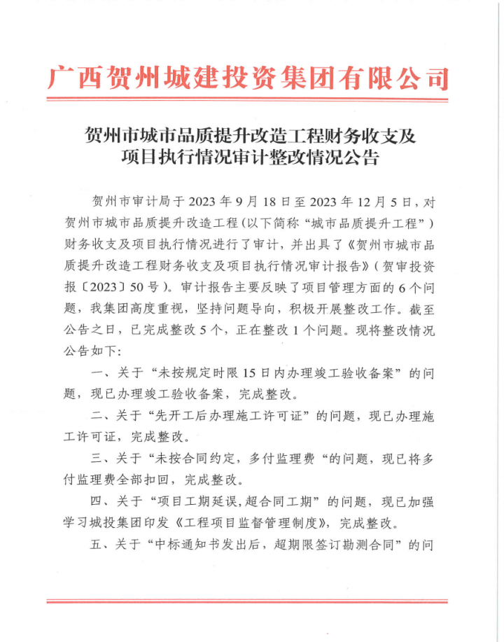 賀州市城市品質提升改造工程財務收支及項目執行情況審計整改情況公告